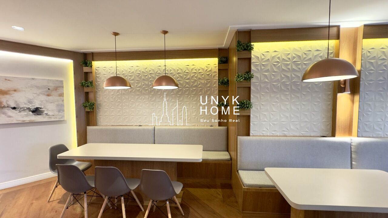 A área social é ampla e agradável, com lareira e acesso à varanda, criando um ambiente perfeito para diferentes composições de sala, como estar, jantar e convivência. O espaço conta também com lavabo, trazendo praticidade para o dia a dia e para receber visitas.