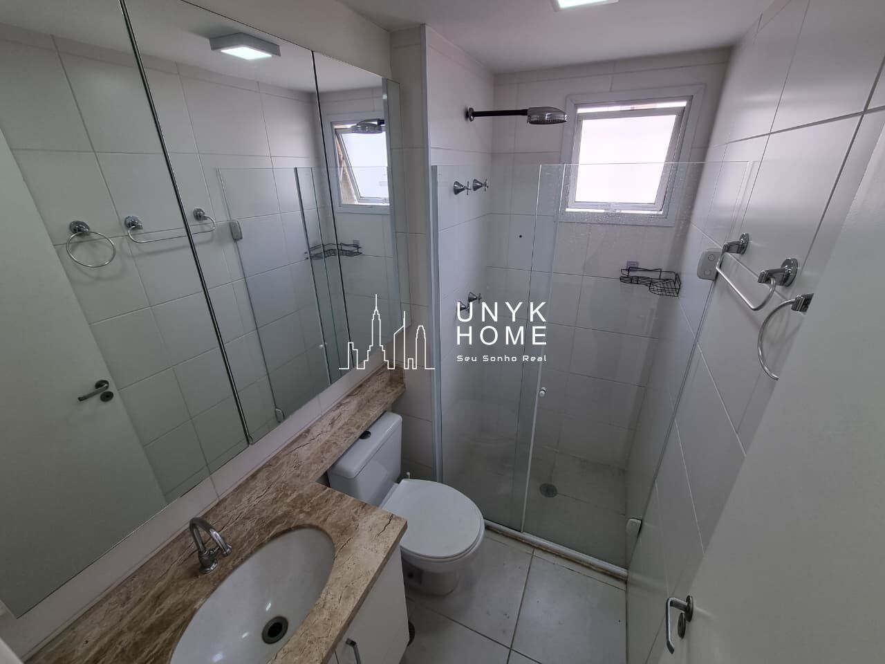 O apartamento possui banheiro social com box e armários.
