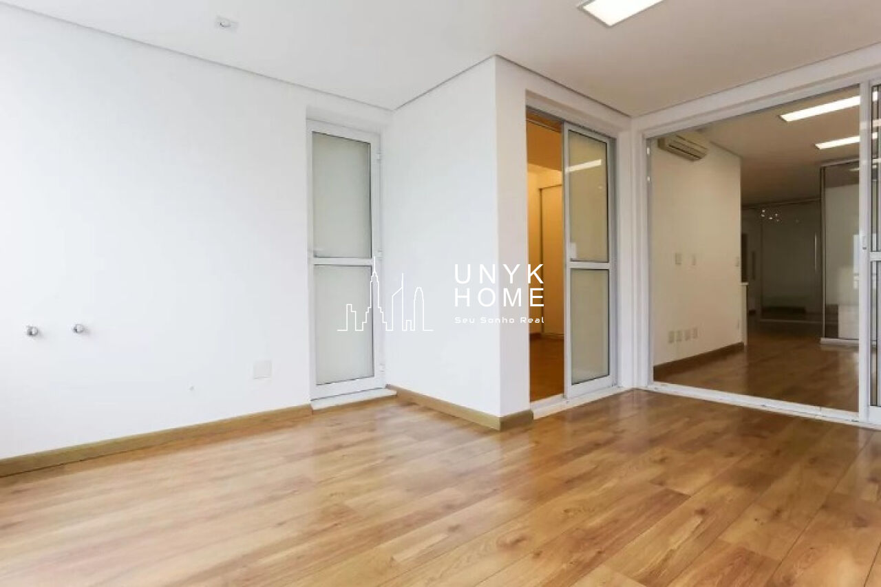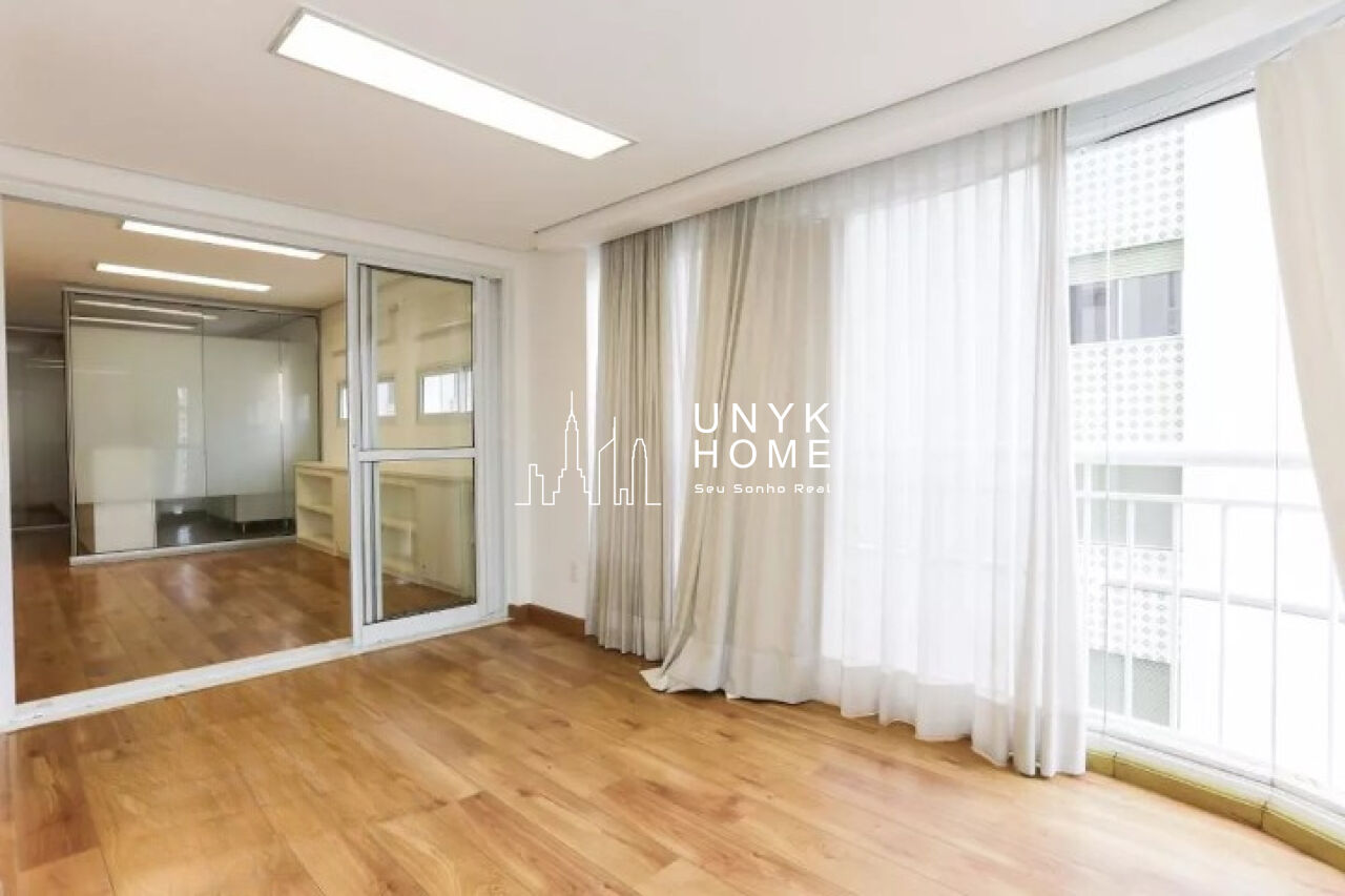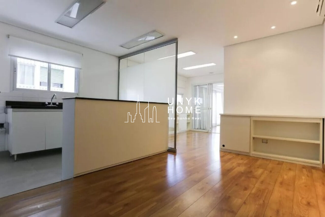 Living para 2 ambientes com piso de madeira, cozinha americana e finos acabamentos.