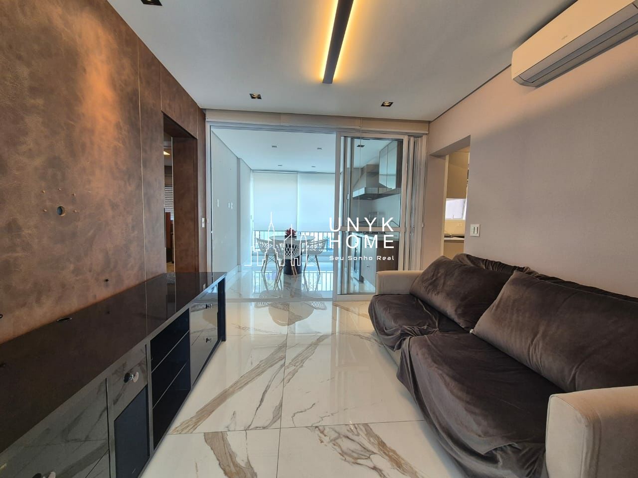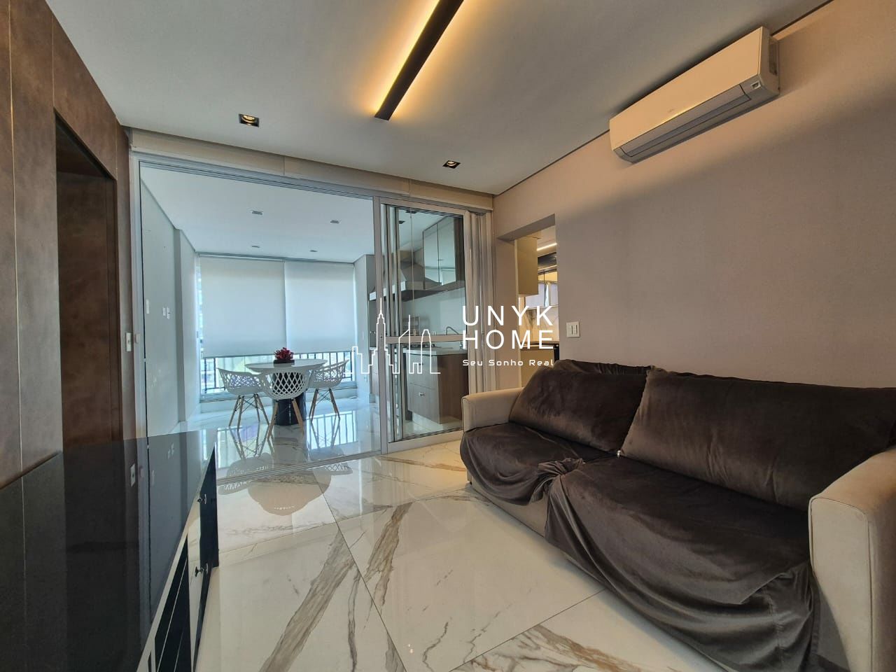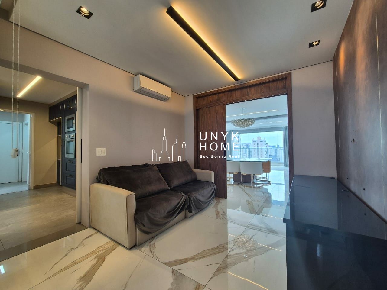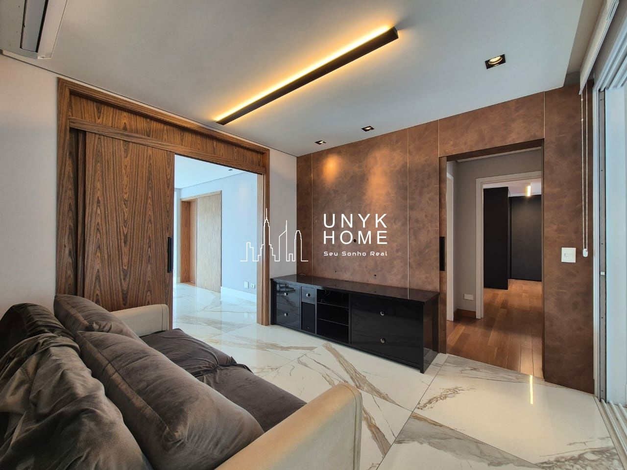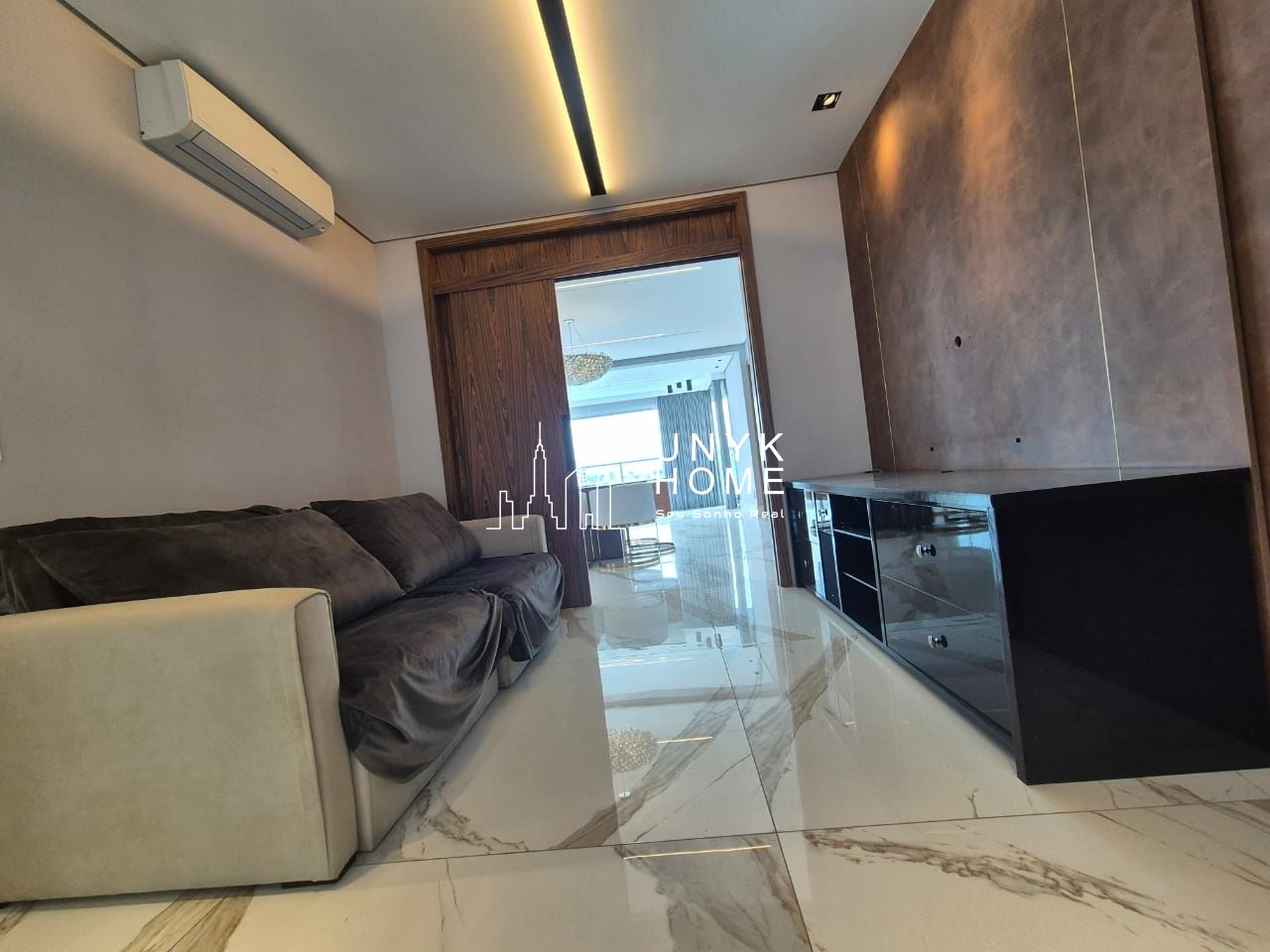 No pavimento inferior, uma sala ampla e mobiliada segue o projeto arquitetônico original, unindo conforto e sofisticação.