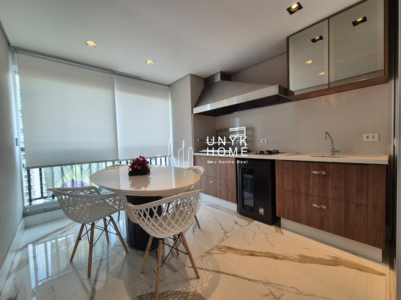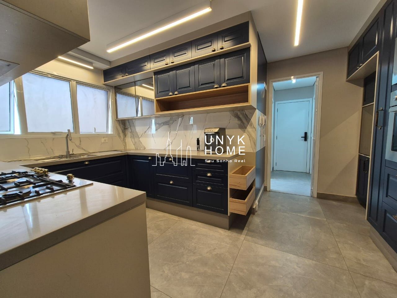 Totalmente equipada com micro-ondas embutido, máquina de lavar louças para 14 serviços, forno elétrico e cooktop por indução, segue o padrão refinado definido pela arquitetura.